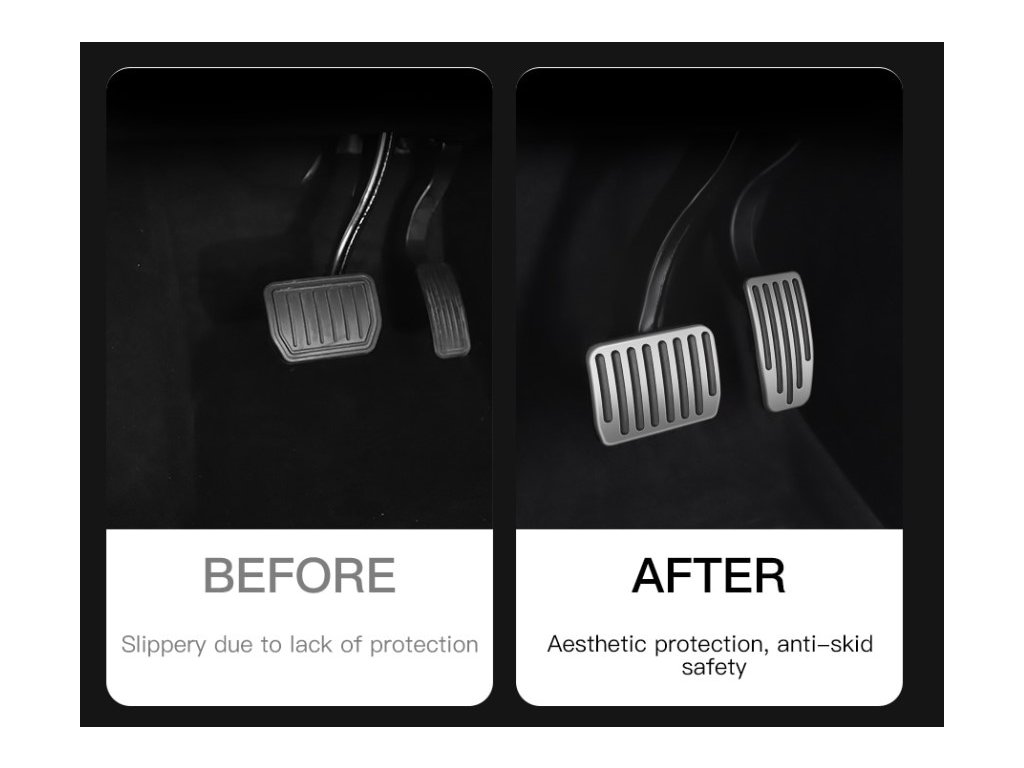 Aluminum Alloy Pedals Covers Elvix for Tesla Model 3/Y Enhance the safety and aesthetics of your Tesla Model 3 or Model Y with these precision-engineered aluminum alloy pedal covers. Designed to provide superior grip and control, the covers feature raised rubber strips that increase friction—even when your shoe soles are wet. Their sleek metallic finish adds a premium touch to your vehicle's interior, while their slip-resistant design ensures better pedal control and driving confidence. Easy to install without tools, these covers offer a snug fit over the existing pedals. They are a must-have upgrade for any Tesla driver looking for both style and functionality. Specifications: Compatibility: Tesla Model 3 & Model Y Material: Aluminum alloy + anti-slip rubber Finish: Brushed silver with black rubber inserts Features: Anti-skid, wear-resistant, corrosion-proof Installation: Tool-free, press-fit design Product weight: Brake: 78g, throttle: 45g Package includes: 1 х Set of Aluminum Alloy Pedals Covers Elvix for Tesla Model 3/Y Not affiliated with Tesla, Inc. Product shown is not official Tesla merchandise and is used for identification purposes only.