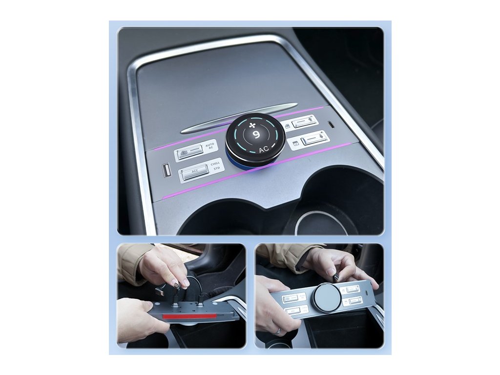 Inteligentní ovládací panel Elvix pro Tesla Model 3/Y – vysokovýkonná verze Vylepšete funkčnost a styl svého vozu Tesla Model 3 nebo Model Y pomocí tohoto inteligentního ovládacího panelu, který je navržen pro hladkou integraci a intuitivní ovládání. Tento ovládací panel s centrálním multifunkčním otočným knoflíkem a speciálními tlačítky pro klimatizaci, média, sklápění zrcátek a nastavení sedadel zvyšuje komfort a pohodlí při řízení. Jeho 1,46palcový IPS displej s ostrým rozlišením 360x360 poskytuje jasnou zpětnou vazbu, zatímco porty USB a Type-C umožňují připojení dalších zařízení. Instalace je jednoduchá a bez nástrojů a ambientní osvětlení dodává interiéru moderní nádech. Ideální pro ty, kteří hledají inteligentní výkon a uživatelsky přívětivá vylepšení. Specifikace: Kompatibilita: Tesla Model 3 / Model Y Displej: 1,46“ IPS, rozlišení 360x360 USB porty: 1× USB, 1× Type-C Systém: C/OS-III Paměť: FLASH W25Q64JV Hlavní čipová sada: GD32F103C8T6 Čipová sada pro správu napájení: RS1562 Vstupní napětí: Type-C 5V Provozní teplota: -20 °C až +60 °C Balení obsahuje: 1 х Inteligentní ovládací panel Elvix pro Tesla Model 3/Y – vysokovýkonná verze Není spojeno se společností Tesla, Inc. Zobrazený produkt není oficiálním zbožím Tesla a je použit pouze pro identifikační účely.
