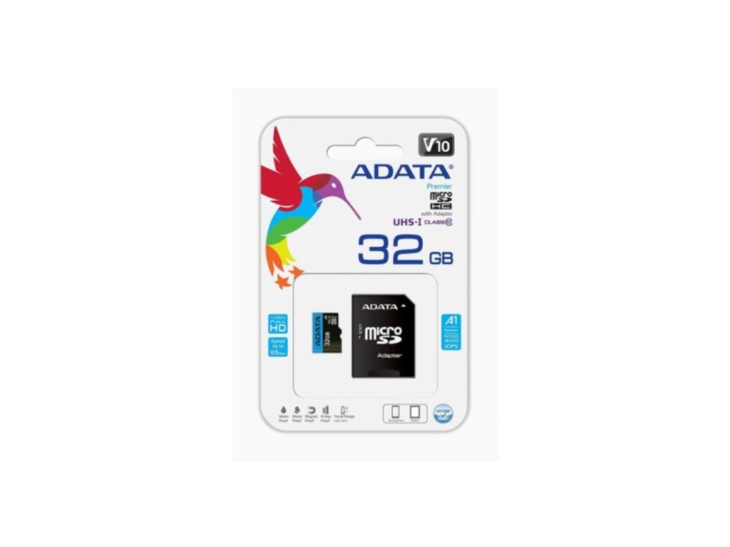 Karta SD ADATA 32 GB z adapterem Karta microSDHC ADATA Premier 32 GB z adapterem SD to wysokowydajne rozwiązanie pamięciowe dla smartfonów, tabletów, aparatów fotograficznych i laptopów. Dzięki obsłudze UHS-I Class 10 i A1 app performance umożliwia płynne nagrywanie filmów w jakości Full HD i szybsze działanie aplikacji. Kompaktowa konstrukcja i dołączony adapter SD sprawiają, że jest ona wszechstronna i łatwa w użyciu w wielu urządzeniach. Cechy: - Szybki transfer danych z prędkością odczytu do 100 MB/s zapewnia szybki dostęp do plików. - Obsługuje płynne nagrywanie filmów w rozdzielczości Full HD i spełnia wymagania klasy prędkości wideo V10. - Klasa wydajności A1 zapewnia szybsze ładowanie aplikacji i działanie na urządzeniach z systemem Android. - Kompatybilna z szeroką gamą urządzeń, w tym smartfonami, tabletami, aparatami cyfrowymi i laptopami. - Zawiera adapter SD ułatwiający korzystanie ze standardowych gniazd kart SD. - Wyposażona w technologię ECC (Error Correction Coding) zapewniającą niezawodne przechowywanie danych. Specyfikacja: Producent: ADATA Marka: ADATA Model: Premier Materiał: tworzywo sztuczne Wymiary: 15×11×1 mm Kraj produkcji: Tajwan Kraj rejestracji marki: Tajwan Standard pamięci: microSDHC Szybkość zapisu karty: W-25 Mbit/s Szybkość odczytu karty: R-100 Mbit/s Klasa szybkości wideo: V10 Pojemność pamięci: 32 GB Klasa wydajności aplikacji: A1 Klasa karty pamięci: Klasa 10 UHS-I Zawartość opakowania: 1x karta SD ADATA 32 GB z adapterem